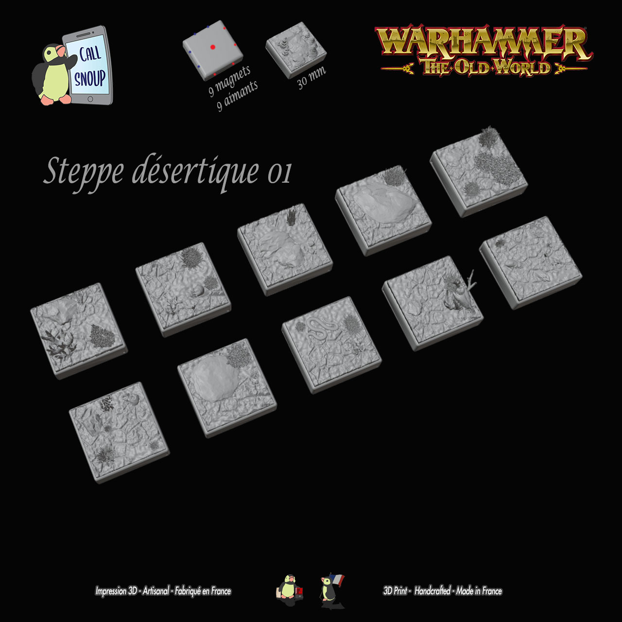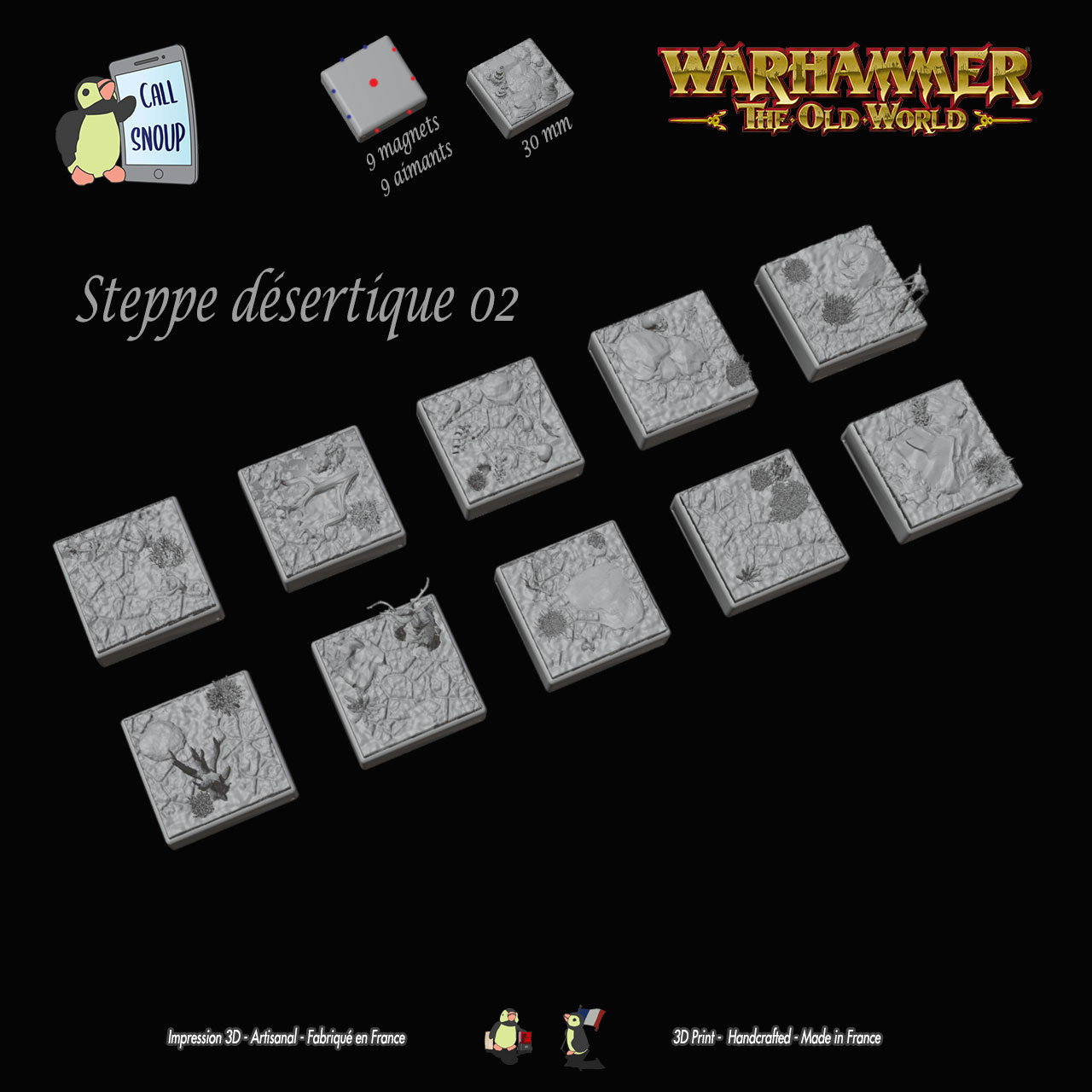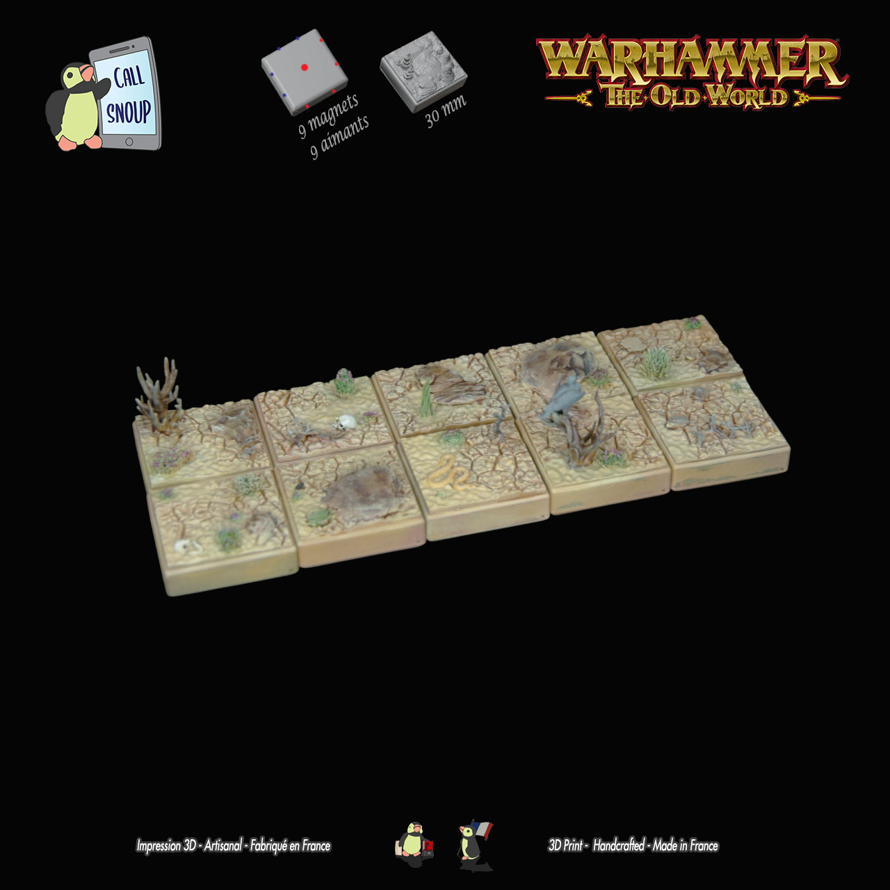 10 Socles magnétiques régimentaires pour The Old World. Seul le thème : Steppe désertique est actuellement disponible, d’autres thèmes pourront voir le jour dans l’avenir. Chaque socle est équipé de 8 aimants latéraux Nord/Sud permettant de se lier aux autres, ainsi que d’un aimant central pour le rangement et le transport. Les bases sont équipées de repères Nord/Sud pour le positionnement (croix et étoile). Ces socles permettent de changer aisément de formation pendant la bataille et de retirer les pertes sans que le plateau de mouvement continue de prendre de la place. Ils remplacent ainsi le plateau de mouvement et le socle de la figurine. Vous pouvez assez facilement tiger les figurines dedans, ils sont fabriqués en résine ABS de haute qualité usinable.