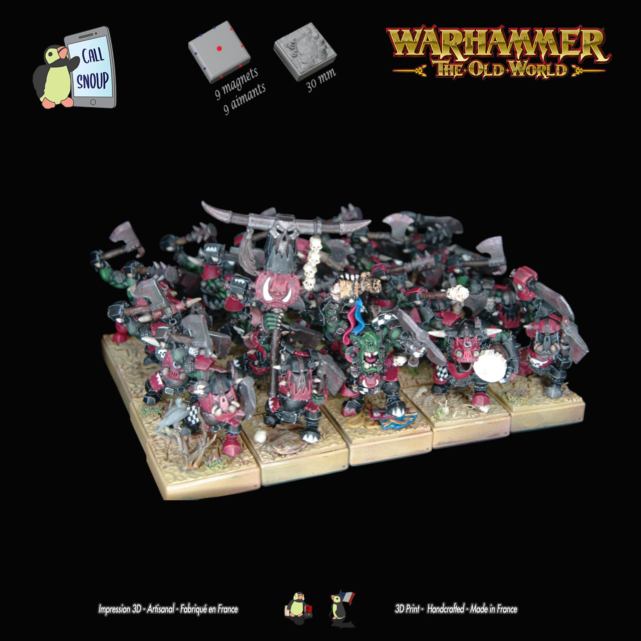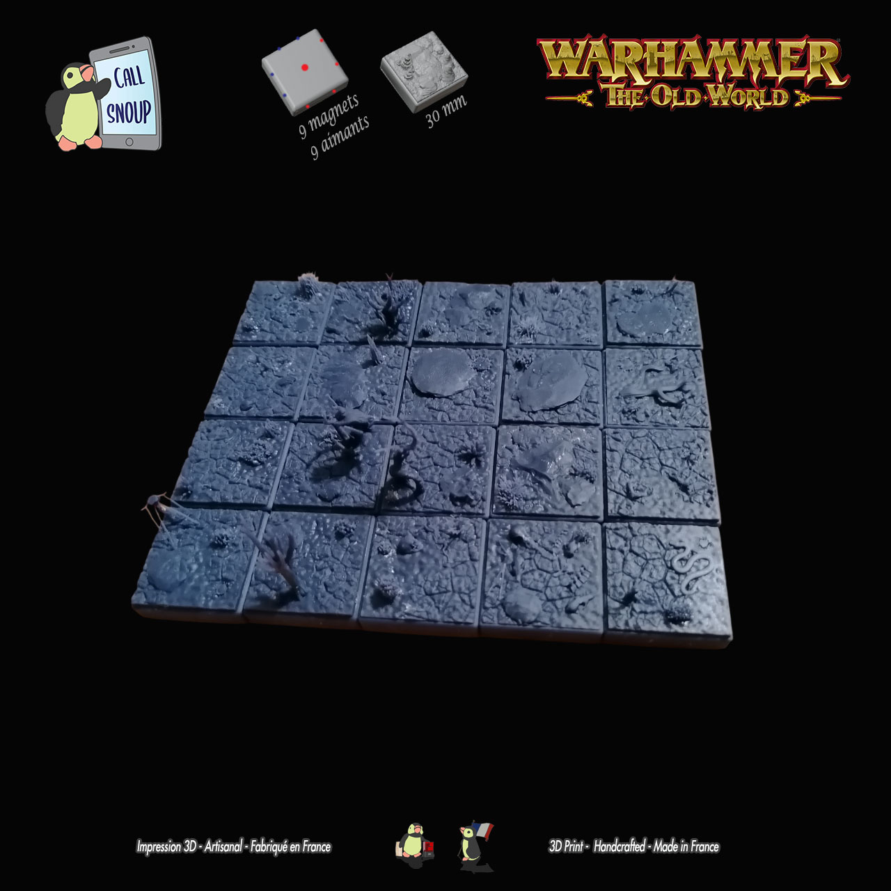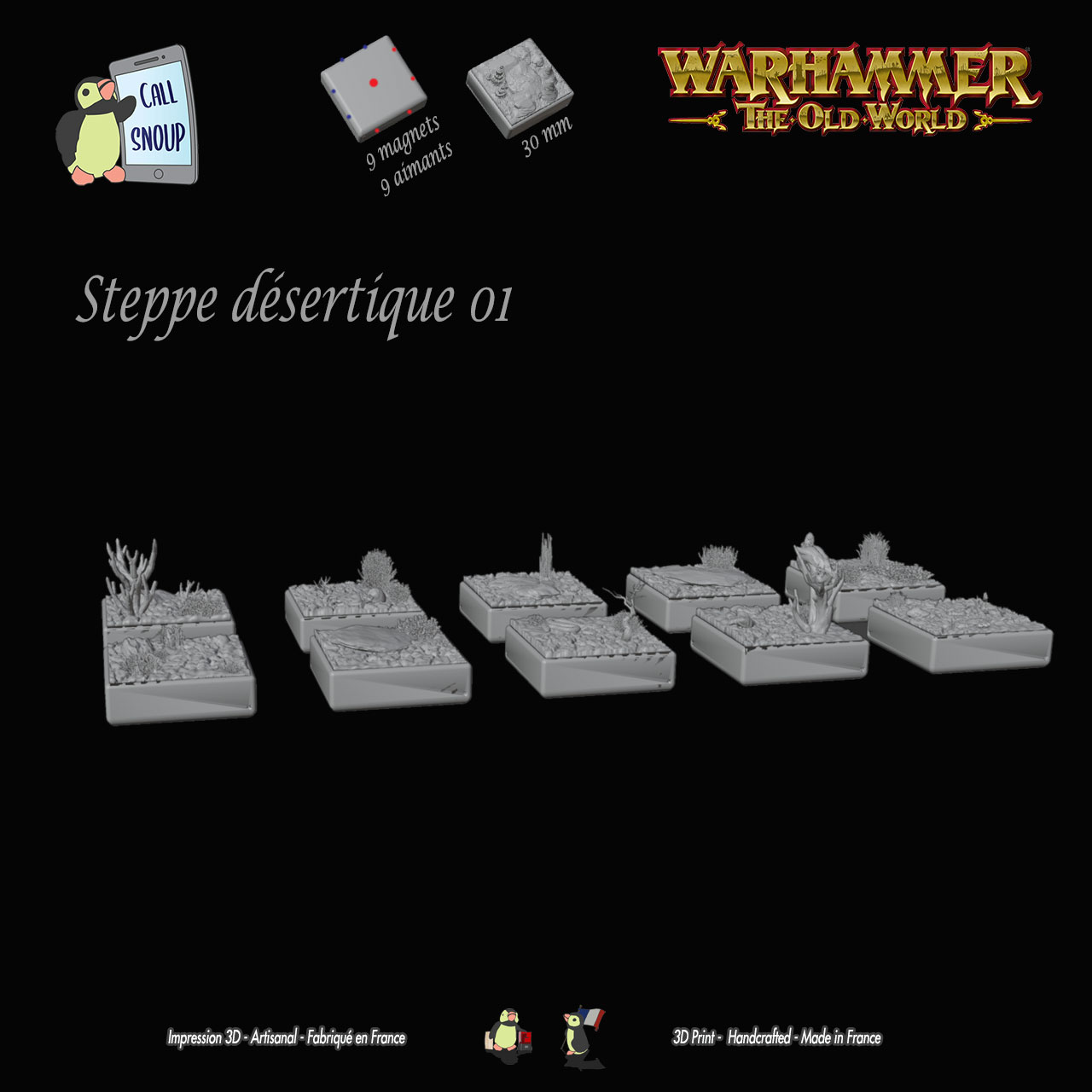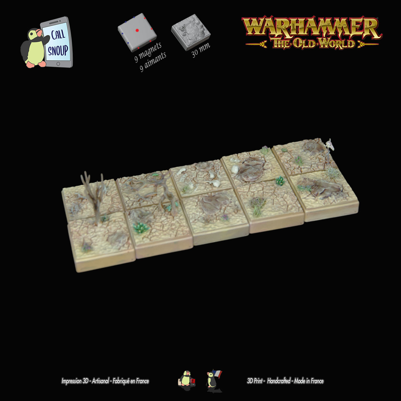 10 Socles magnétiques régimentaires pour The Old World. Seul le thème : Steppe désertique est actuellement disponible, d’autres thèmes pourront voir le jour dans l’avenir. Chaque socle est équipé de 8 aimants latéraux Nord/Sud permettant de se lier aux autres, ainsi que d’un aimant central pour le rangement et le transport. Les bases sont équipées de repères Nord/Sud pour le positionnement (croix et étoile). Ces socles permettent de changer aisément de formation pendant la bataille et de retirer les pertes sans que le plateau de mouvement continue de prendre de la place. Ils remplacent ainsi le plateau de mouvement et le socle de la figurine. Vous pouvez assez facilement tiger les figurines dedans, ils sont fabriqués en résine ABS de haute qualité usinable.