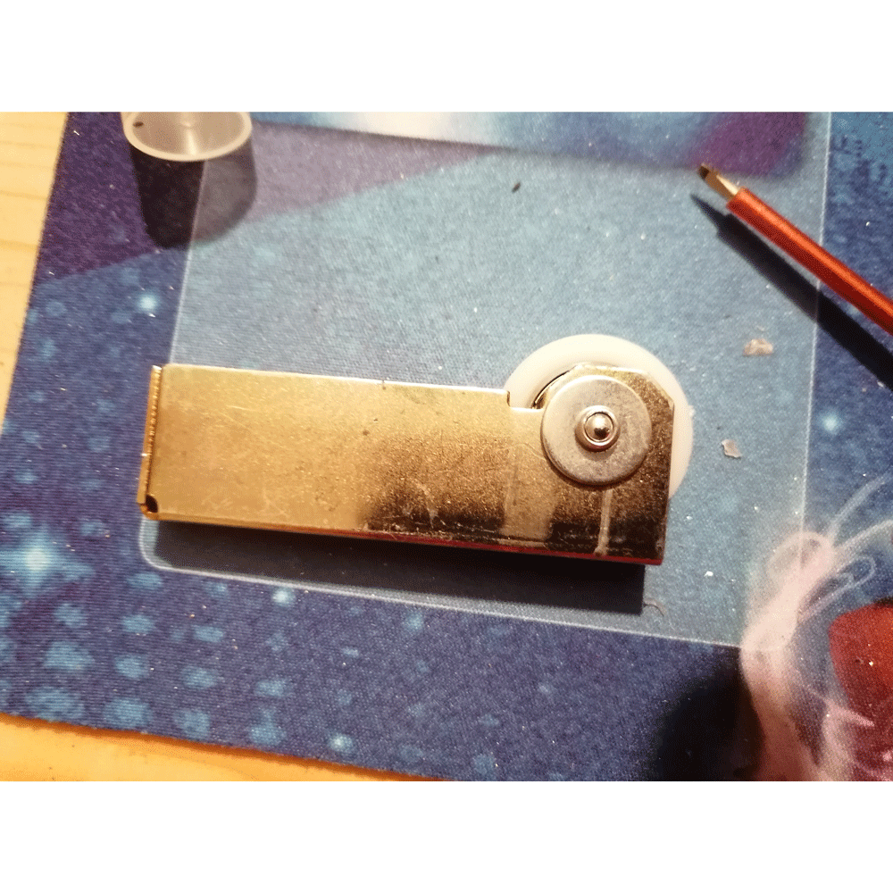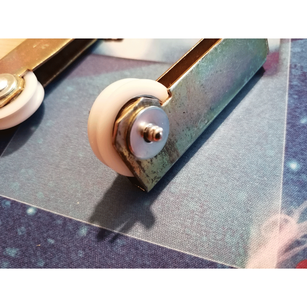 Sur les roulements sont insérés des bagues en ABS pour empêcher le frottement latéral de la roue sur le briquet, celles-ci peuvent être un peu fragile : il convient d'être prudent lors de l’insertion dans le briquet vu qu’il faudra parfois forcer légèrement (tant qu’elle ne perdent pas plus de la moitié de leur épaisseur elle restent fonctionnelles). Je conseille l’utilisation d’un tournevis ou d’une tige pour centrer le roulement sur le briquet. En cas de casse trop importante, sortir les protection en les tapant avec un tournevis par exemple et les remplacer en insérant les nouvelles de part et d’autre du roulement concerné, faire cela doucement avec une pince si nécessaire. Lors de l’installation sur le briquet, forcez légèrement pour faire rentrer le rivet. L’application nécessite une pince à rivet. Une fois le rivet serti, poncez l’excédent si besoin. L’angle de la poulie n’étant pas optimal pour les rails, je conseille  d’installer les portes sur les bords extérieurs ou intérieurs des rails afin d’avoir une meilleure glisse. Le kit permet de remplacer les roulements d’un placard pour un coût raisonnable (le remplacement des briquet revenant à plus d’une centaine d’euros), il nécessite toutefois d’avoir quelques compétences en bricolage.